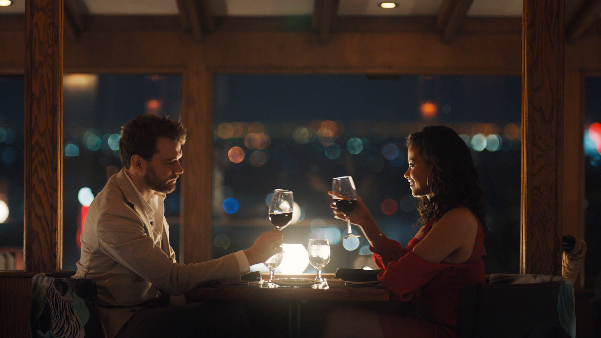 After unknowingly double-booking her boss for a client dinner on his wedding anniversary, Cherie (Balinska) unfortunately has to step in. She meets the client, Ethan (Asbæk), at his stunning home and is pleased to find that he’s both handsome and charismatic. The two enjoy dinner and an impromptu roller rink outing, quickly shifting the professional evening into a date.