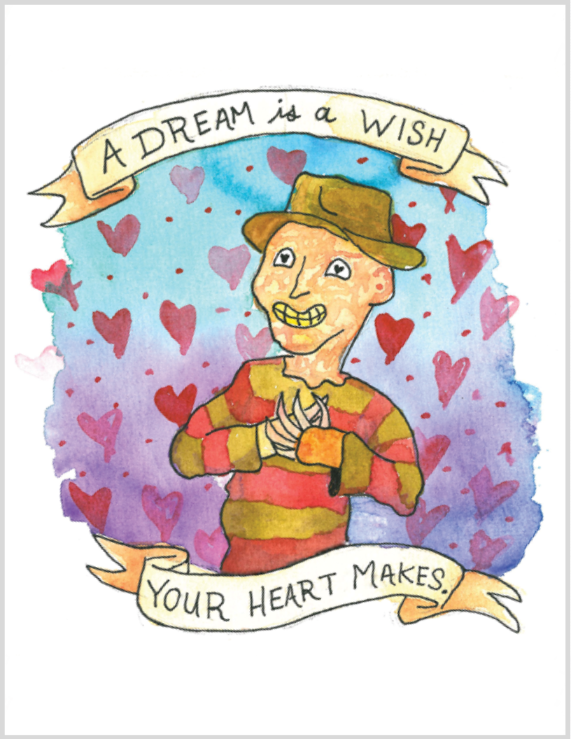 A Dream is a Wish Your Heart Makes… and Freddy is waiting. Have your heart torn out by the sheer beauty of a horror icon. This print features a hand-drawn design by local Chicago artist @elbeesea91. Printed on 11 x 17, high quality paper, with free shipping in the US.